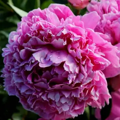 Цветки этого сорта являются его гордостью. Пион "Голубая Жемчужина" имеет махровую структуру цветка с мелким размером и диаметр, достигающий 7 см, высота цветка составляет 14 см Окраска цветка пурпурно-розовая.