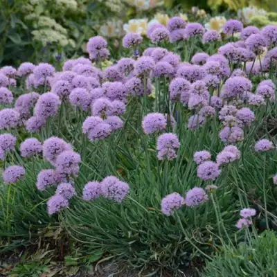 Пик декоративности приходится на июль–август. На фоне сизой листвы поднимаются изящные шаровидные соцветия до 6 см в диаметре. Цвет лепестков — мягкий розово-фиолетовый, который отлично сочетается с серо-зелёной палитрой многолетников. Запах едва уловим, не навязчив. Цветение продолжительное, устойчиво к осадкам и солнечной активности.