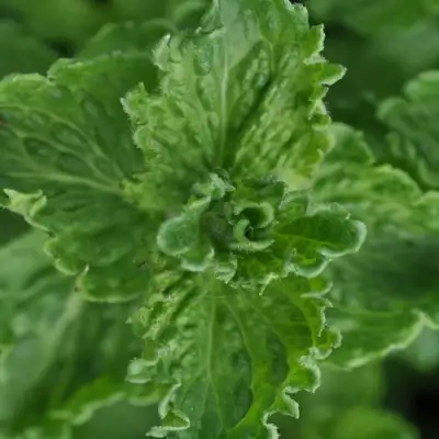 Мята Криспа — многолетнее травянистое растение с быстрым ростом. Высота взрослых кустов достигает 50–60 см, при этом растение формирует плотную крону шириной до 40 см. Побеги прямостоячие, прочные. Листья овальные, гофрированные, ярко-зелёные с лёгким блеском. Визуально они создают ощущение движения — за счёт волнистой поверхности.