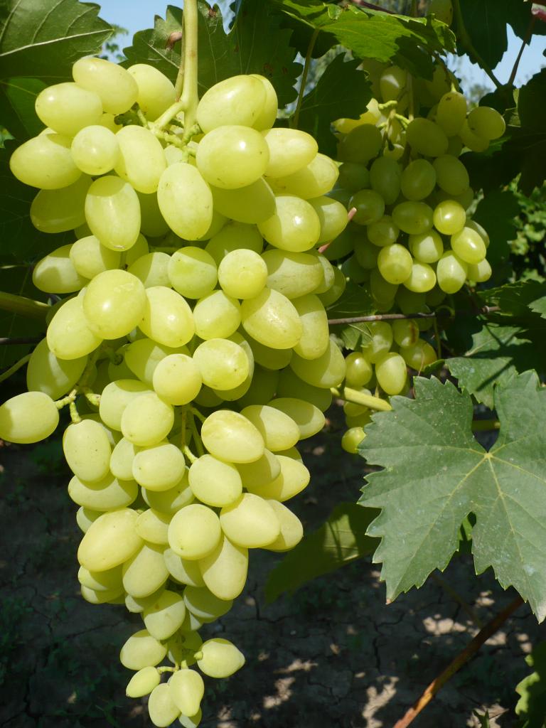 Грозди крупные, конической формы, средней плотности, весом 500–800 г. Ягоды белые, продолговато-сосковидные, средним весом 8–9 г. Мякоть сочная и мясистая, кожица тонкая, вкус гармоничный. Особенность сорта в том, что на одной грозди могут встречаться ягоды с мягкими семенами и с полноценными семенами, что не влияет на вкус и качество плодов.